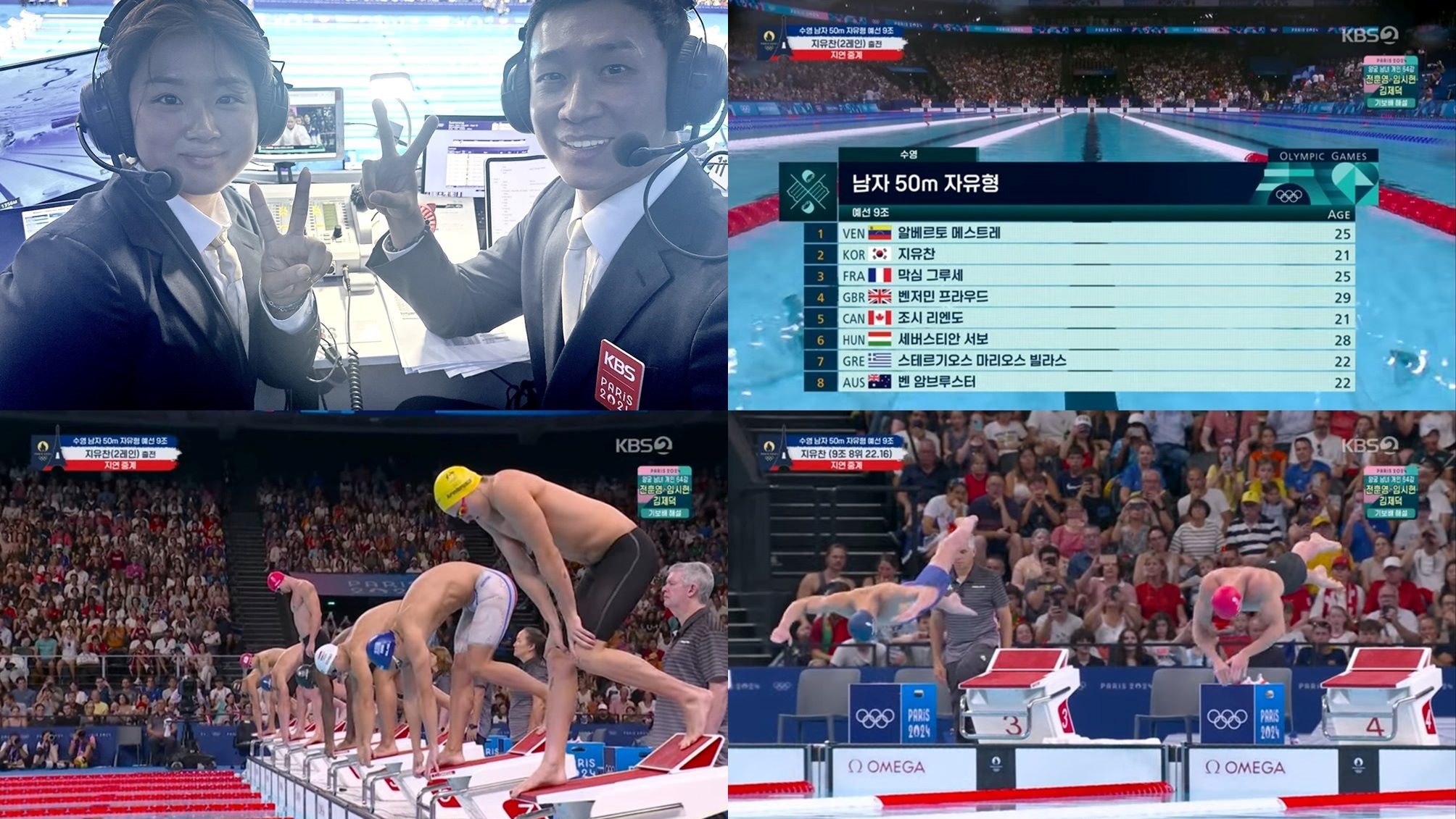지유찬은 1일 수영 남자 자유형 50m 예선에 출전했다. 정유인 해설위원은 “지유찬은 초반 스피드가 좋은 선수다. 초반에 빠른 만큼 후반에 얼마나 버티느냐가 관건이다. 좋은 기록 기대해 보겠다”고 말했다. 하지만 아쉽게도 지유찬은 예선에서 22초16를 기록, 전체 28위로 상위 16명에게 주어지는 준결승 티켓을 따내지 못했다. 정유인 위원은 “초반엔 선두에 가까웠는데 후반에 처졌다”며 못내 아쉬워했다.