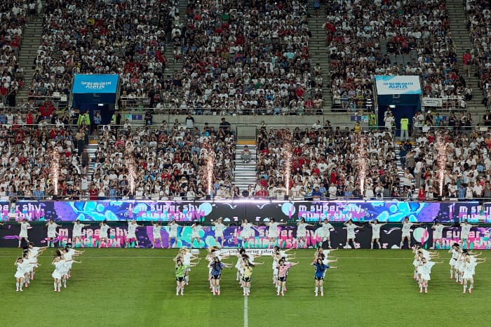 한편 뉴진스는 이번 하프타임 쇼에서 화려하고 세련된 디자인으로 특별제작한 축구 유니폼을 입어 스포티하고 에너제틱한 매력을 발산했다. 아울러 멤버들은 경기 시작 전 진행된 시축 행사에도 참여해 열기를 끌어올렸다.