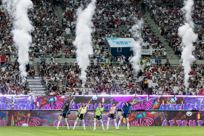 축구팬뿐 아니라 남녀노소 누구나 알고 있는 메가 히트곡의 힘은 강력했다. 대형 스타디움은 함성으로 가득 찼고, 청량감 가득한 이들의 노래는 한여름 밤 무더위를 날려버리기 충분했다.‘Attention’의 전주가 흘러나오고 “여러분, 준비 되셨나요? 렛츠 고(Let's Go)”를 외치며 뉴진스가 등장하자 6만여 관중이 일제히 환호했다.