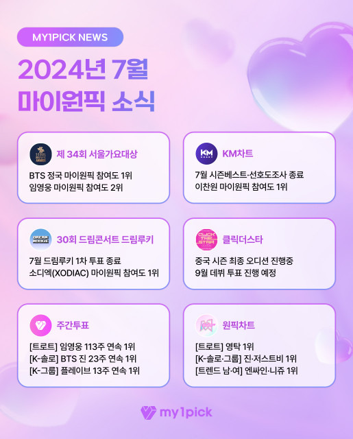 마이원픽 주간 투표 결과, K-POP 그룹 부문에서 플레이브가 13주 연속 1위를 차지했고, K-POP 개인 부문과 트로트 부문에는 각각 BTS 진(23주 연속), 임영웅(113주 연속)이 1위를 차지했다. 주간 투표 1위를 차지한 세 아티스트는 7월 월간 랭킹에서도 최고 순위를 기록했다.