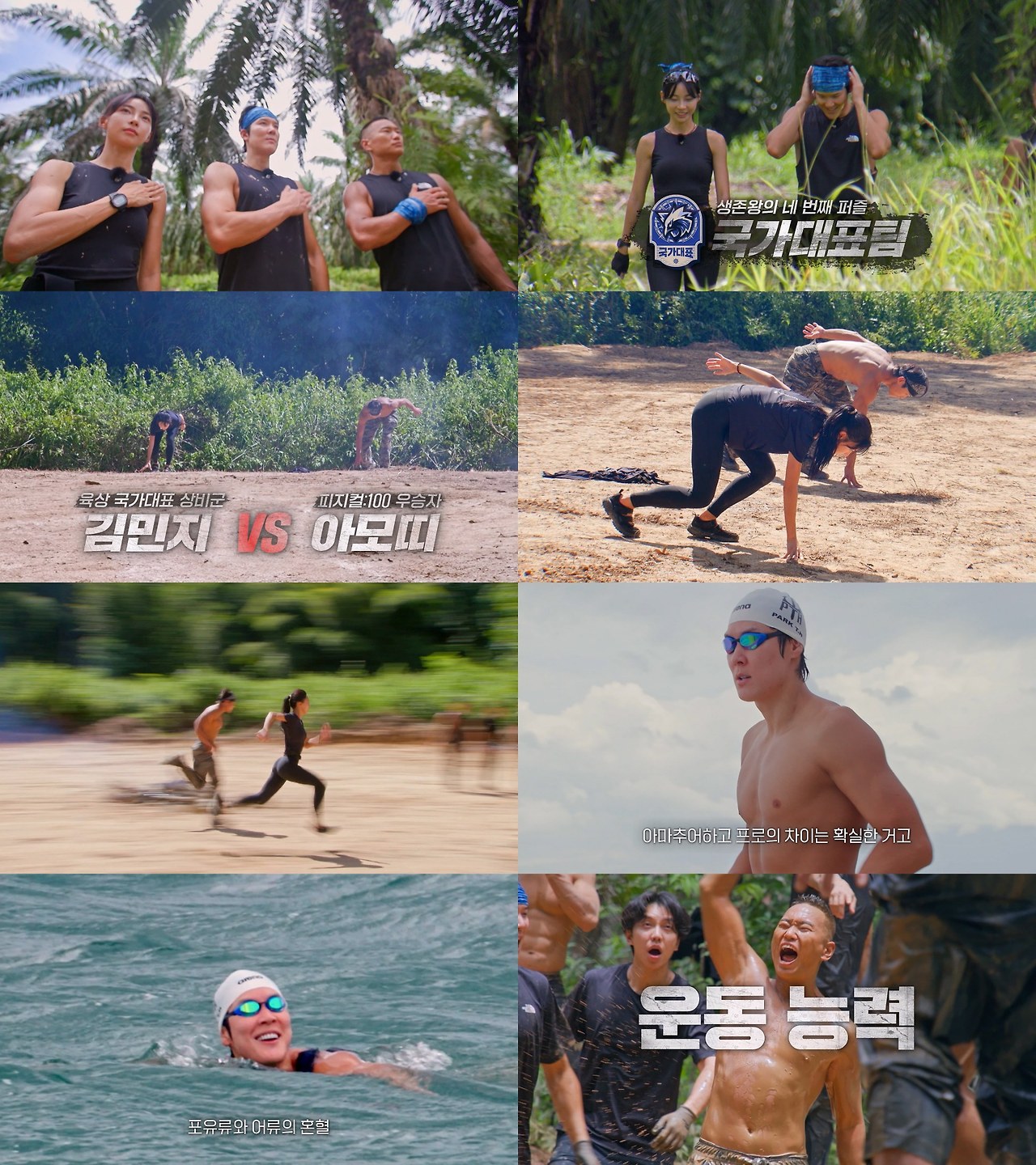 80억 인구 중 운동 능력으로는 자타공인 정점에 있는 ‘국가대표 팀’의 위풍당당한 입장에 “전 세계 수영 1등을 어떻게 이기냐”며 “확실히 선수는 선수다”라는 아우성이 쏟아졌다. ‘국가대표 팀’의 홍일점인 육상 국가대표 상비군 김민지는 “달리기로 하면 제가 다 이길 자신 있다. 여기서 저를 이길 사람은 없다”며 예능 ‘피지컬:100’의 우승자 아모띠의 도전도 호기롭게 받아들였다. 많은 출연진이 아모띠의 승리를 점친 가운데, 휘슬이 울리자마자 김민지는 압도적인 승리로 대반전을 선사했다. 또, ‘인민 루니’로 불린 전 북한 국가대표 축구선수 정대세가 진흙탕 속에서 한 손으로 장어를 잡아채는 장면도 시선을 강탈한다.