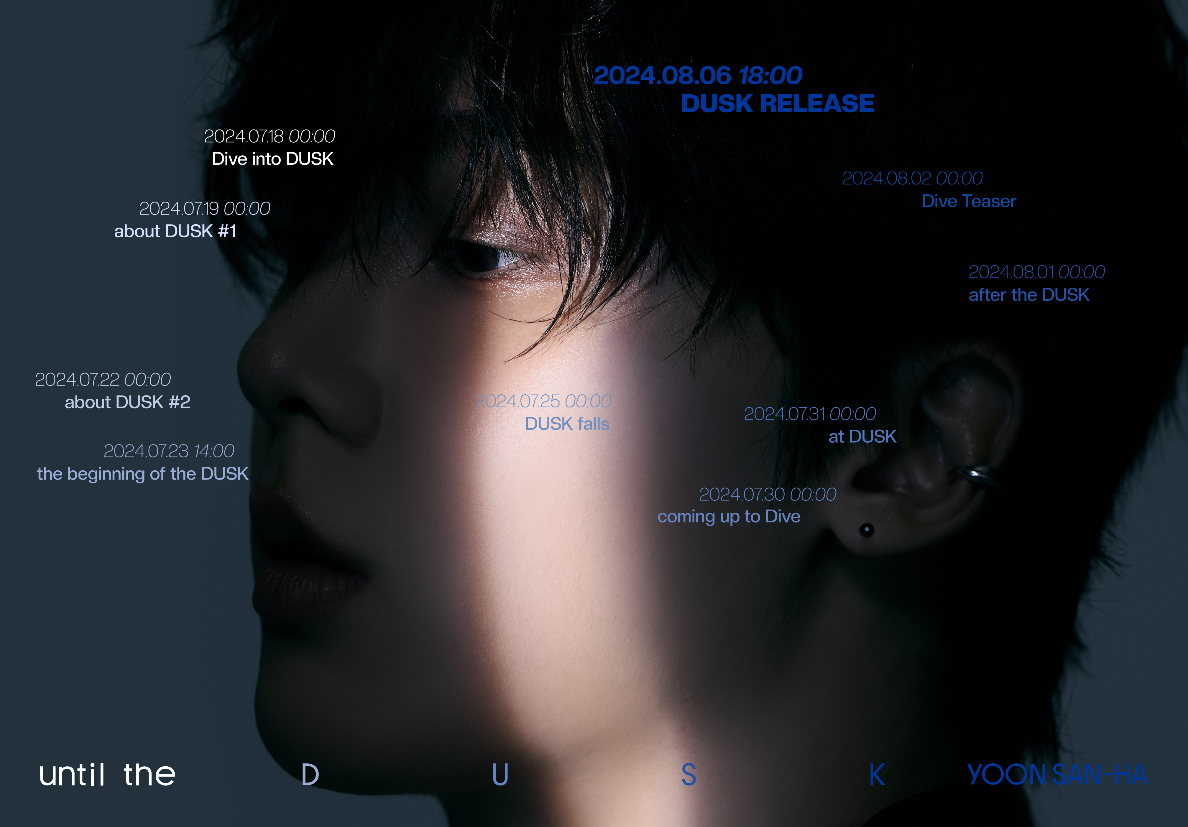 ‘until the DUSK’(황혼의 시간까지)라는 제목의 스케줄 포스터에 따르면, 윤산하는 발매 전까지 ‘Dive into DUSK’(황혼에 빠지다), ‘about DUSK’(황혼에 대하여) #1과 #2, ‘the beginning of the DUSK’(황혼의 시작), ‘DUSK falls’(황혼에 깃들고 있다), ‘coming up to Dive’(다이브에 다가가다), ‘at DUSK’(황혼 녘에), ‘after the DUSK’(황혼 이후), ‘Dive Teaser’(다이브 티저) 등 티저를 순차적으로 공개할 예정이다.