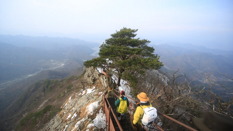 산길은 점점 험준해지고, 눈 덮인 철계단을 조심스럽게 밟으며 한 걸음씩 정상에 가까워진다. 고된 길 끝에 드디어 영봉에 도착하자, 거친 암벽 위로 부드럽게 내려앉은 눈이 장관을 그려낸다. 상쾌한 겨울바람이 뺨을 스치자 오랜 산행의 피로가 눈 녹듯 사라지고 정상에서 바라본 풍경은 그 자체로 깊은 감동을 안겨준다. 보덕암 방향으로 하산하기 위해 겨울 산행의 긴장을 놓지 않은 채 발걸음을 신중히 옮긴다. 중봉에 도착한 일행은 산과 산 사이로 잔잔히 흐르는 충주호를 내려다보며 자연의 풍경에 마음을 빼앗긴다.