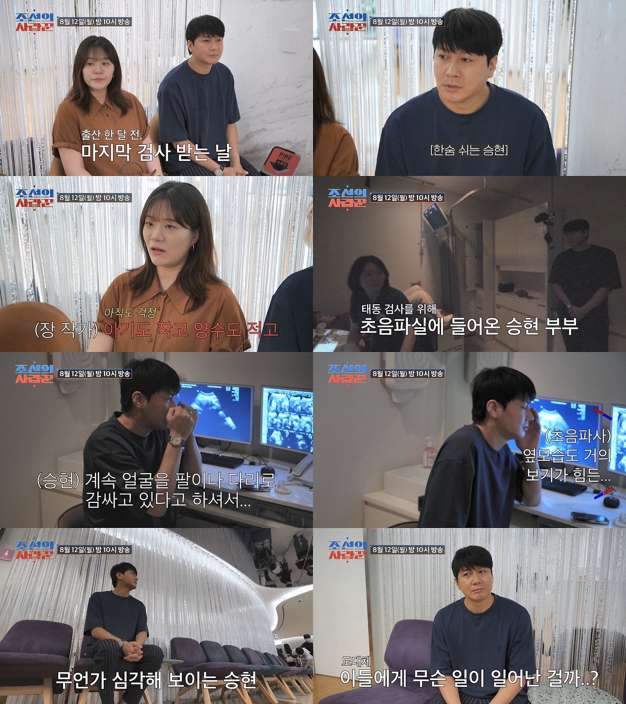 초음파 검사가 종료된 후 김승현은 혼자 어디론가 이동했다. 어두운 표정으로 자리에 앉은 김승현은 초조한 듯 안절부절못했다. 김승현이 산부인과에서 심각해진 이유는 본 방송에서 공개된다.