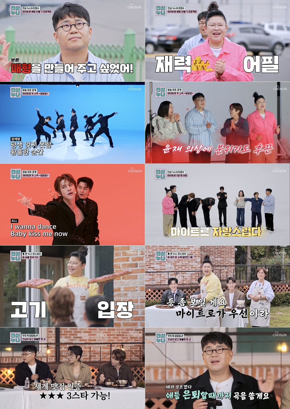 급기야 이영자는 “사랑하는 영수 씨”로 운을 뗀 뒤 “영수 씨가 앞으로 작곡 안 해도 내가 벌어 놨다. 이제 마이트로의 매형 하자”라고 프러포즈까지 했지만, 조영수는 김숙을 선택해 웃음을 자아냈다. 이어 ‘밤밤밤’의 첫 무대를 보기 위해 스튜디오로 이동한 진심 누나들과 조영수. 빈 무대 위 다섯 명의 멤버들을 비추는 조명이 들어오고, 곡을 더욱 돋보이게 하는 완벽한 칼군무에 조영수와 진심 누나들은 입을 다물지 못했다. 이와 함께 열혈 댄스로 인해 정윤재의 재킷 단추가 떨어져 상반신이 시원스럽게 노출되는 해프닝이 벌어졌지만, 정윤재는 무대에만 집중하며 공연을 무사히 마쳤고, 공연이 끝난 뒤 진심 누나들이 정윤재의 단추를 서로 갖기 위해 쟁탈전을 벌여 폭소를 유발했다.