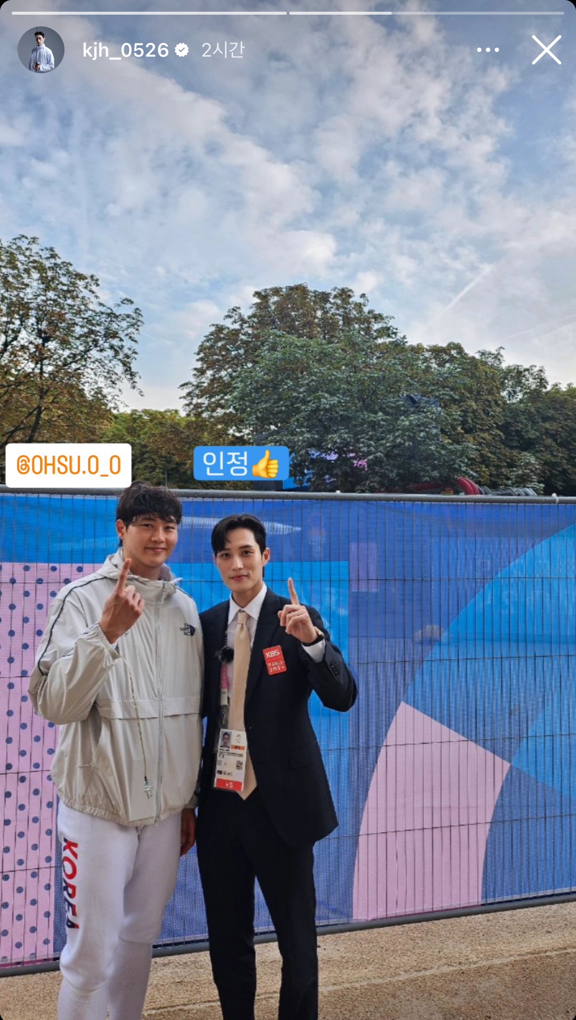 한편, 해설을 끝낸 김준호 위원의 개인 SNS에는 오상욱과 같이 찍은 사진이 올라와 눈길을 끌었다. 두 사람은 검지를 치켜들고 다정한 투 샷으로 훈훈함을 자아냈다. 김준호 위원은 사진에 '인정'이라고 적어 후배에 대한 자부심을 드러냈다.