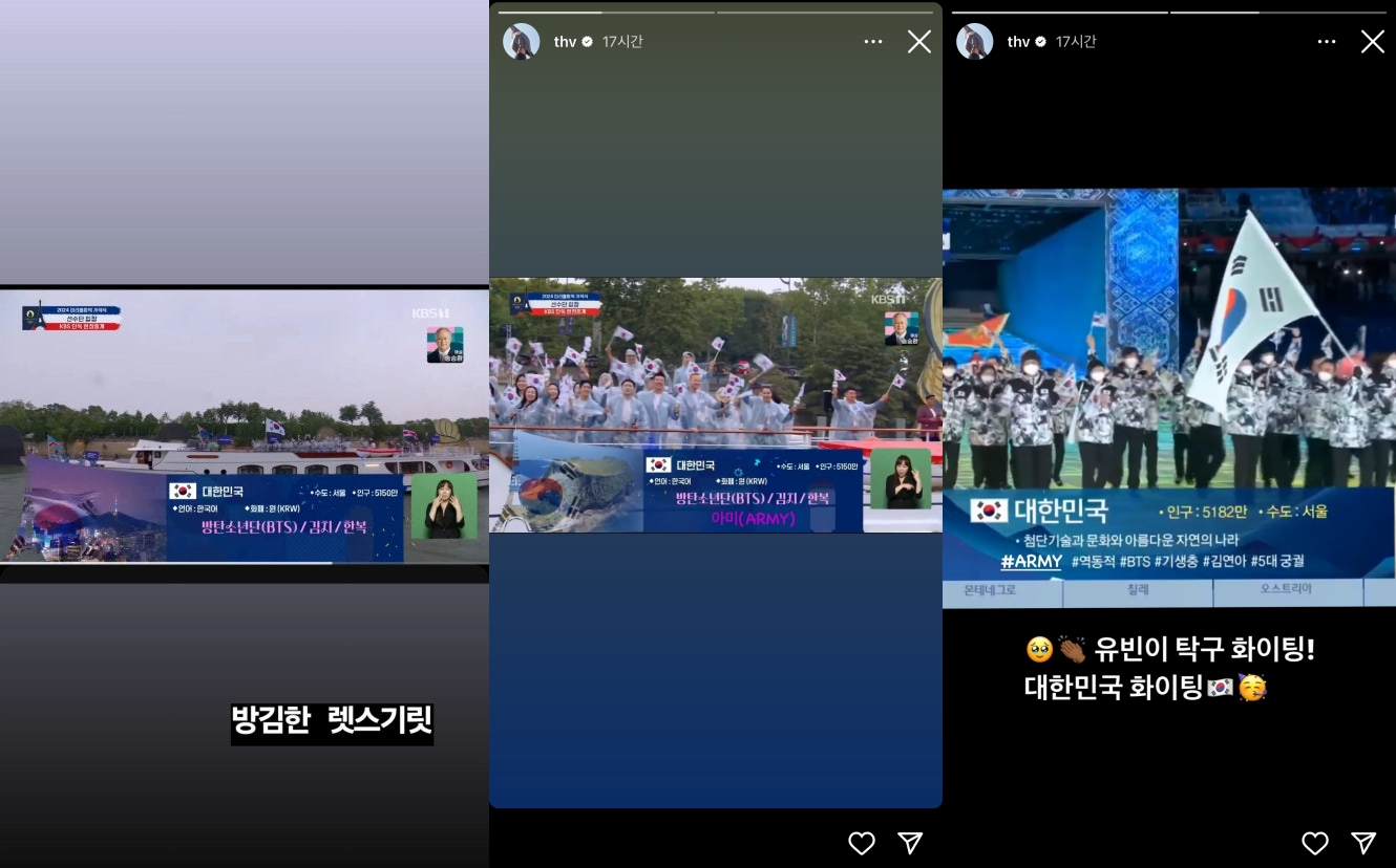 지난 27일 RM은 개인 SNS에 '2024 파리올림픽' KBS 개막식 화면 일부를 캡쳐해 게시했다. KBS는 이번 2024 파리올림픽 개막식에 AI를 활용해 국가별 3가지 키워드를 제시했다. 대한민국 선수단이 입장할 때는 방탄소년단(BTS), 김치, 한복이 나라를 대표하는 3가지 키워드로 제시됐다. 이에 RM은 '방김한 렛스기릿'이라며 해당 장면을 개인 SNS에 올려 기쁨을 표시했다. 뷔는 같은 KBS 개막식의 AI 키워드 밑에 '아미(ARMY)'라고 BTS의 팬덤명을 합성해 팬 사랑을 드러냈다. 또, 뷔는 탁구 국가대표 선수 '삐약이' 신유빈 선수의 경기를 지켜보며 "유빈이 탁구 화이팅! 대한민국 화이팅"이라며 응원글도 남겼다.