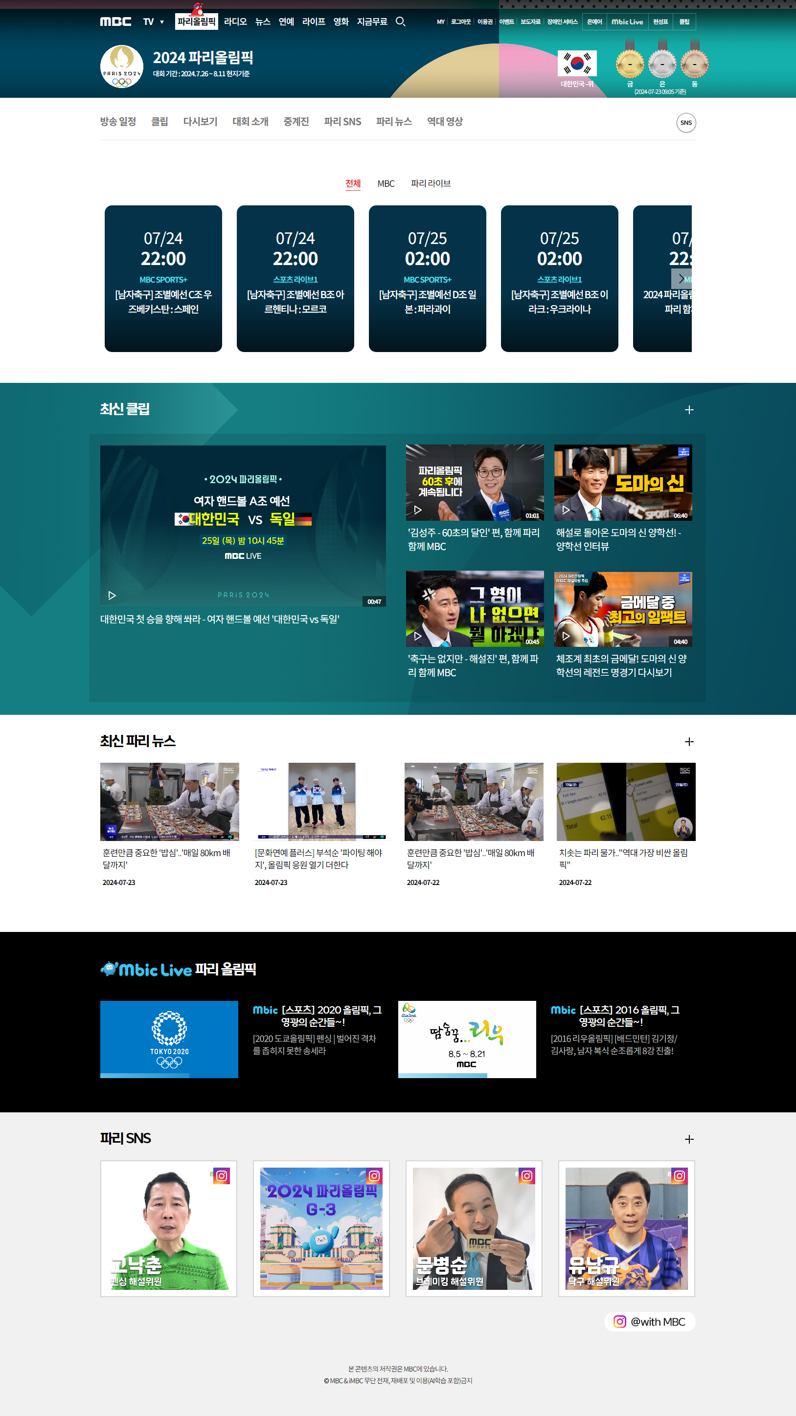 ‘MBC 2024 파리올림픽’ 홈페이지(PC) 메인 갈무리 24일(수) MBC는 ‘MBC 2024 파리올림픽’ 홈페이지(www.imbc.com/2024paris)를 열고, 오는 26일부터 8월 11일까지(현지 기준) 17일간 열리는 ‘2024 파리올림픽’의 실시간 라이브와 미방 중계 서비스, 24시간 라이브 채널 등을 운영한다고 밝혔다.