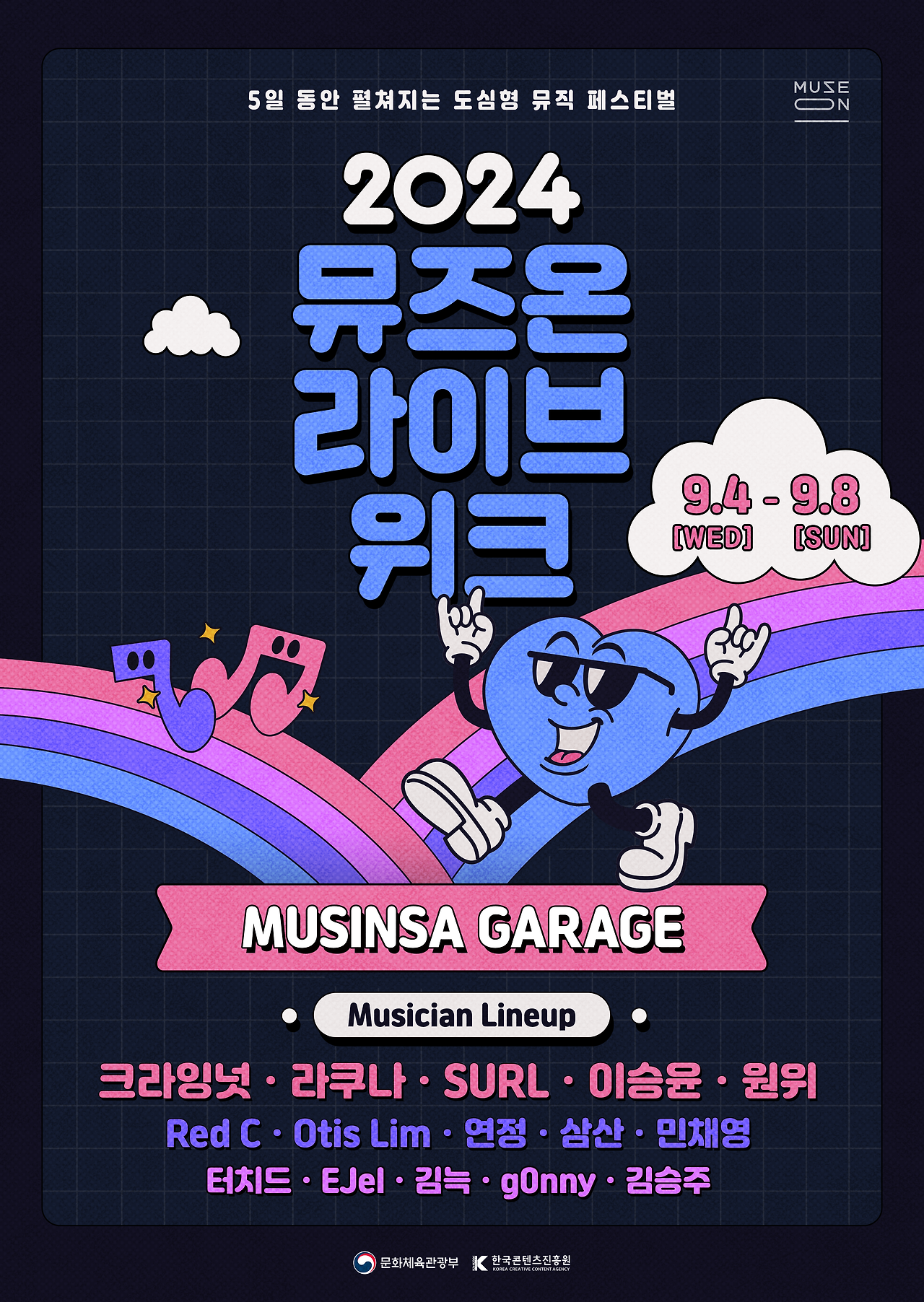 홍대 인근 공연장 ‘무신사 개러지’에서 열리는 이번 공연에는 ‘뮤즈온 2024’ 사업을 통해 선발된 뮤지션 10팀이 무대에 오른다. 매일 공연별로 신인 뮤지션 2팀과 선배 뮤지션 1팀이 무대를 구성해 관객들에게 날마다 다채로운 음악을 들려줄 예정이다.