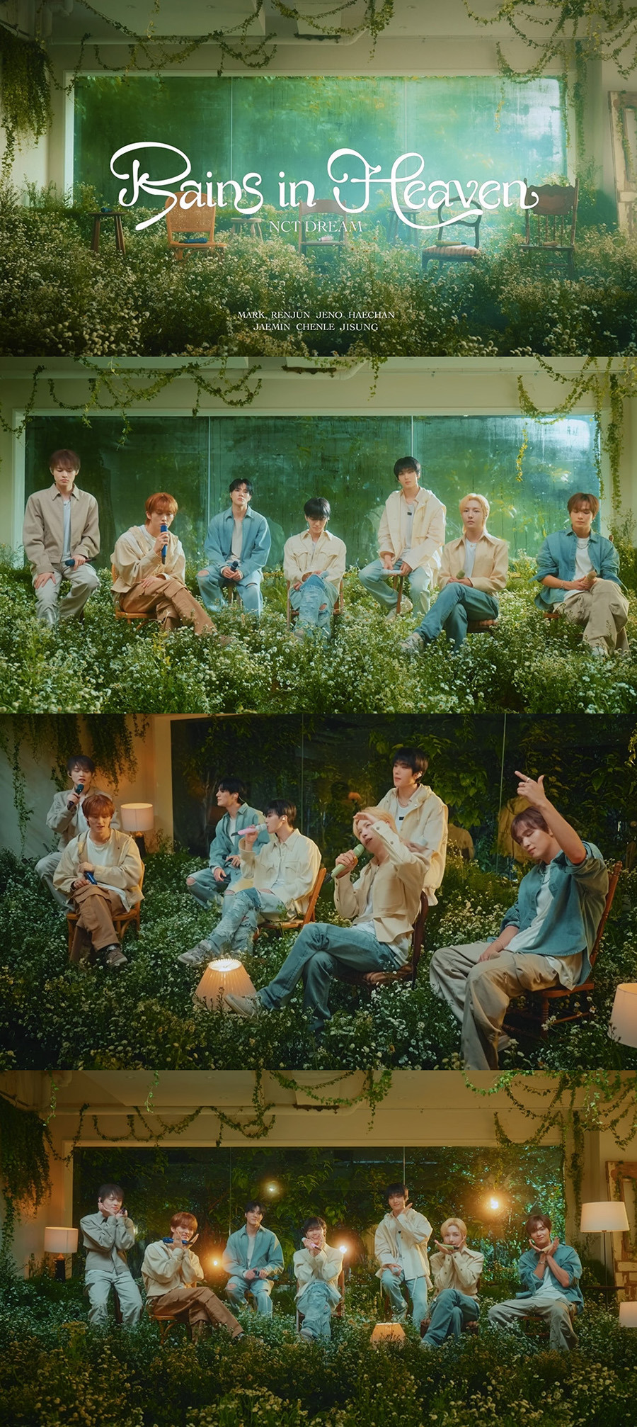 이번 영상은 숲을 연상케 하는 산뜻한 공간에 다같이 모여 노래하는 NCT DREAM의 모습과 따뜻한 분위기를 연출하는 감각적인 영상미가 어우러져 보는 이들에게 힐링을 안긴다. 신곡 ‘Rains in Heaven’은 리듬감 있는 드럼과 베이스, 감성적인 신스가 조화롭게 어우러진 1980년대 스타일의 팝 곡으로, 마크가 작사에 참여한 가사에는 지치고 힘든 이들의 아픔을 공감하고, 곁에서 힘이 되어주겠다는 약속과 위로를 담았다.