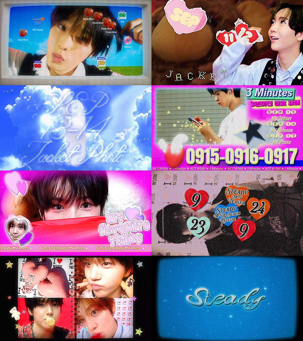 NCT WISH(엔시티 위시, 에스엠엔터테인먼트 소속)의 첫 번째 미니앨범 ‘Steady’(스테디) 스케줄 클립이 공개되어 화제다. 오늘(3일) 0시 NCT WISH 공식 SNS 채널 등을 통해 첫 미니앨범 ‘Steady’의 스케줄 클립이 오픈되었으며, NCT WISH 특유의 키치하고 톡톡 튀는 감성이 돋보이는 영상으로 뜨거운 반응을 얻고 있다.