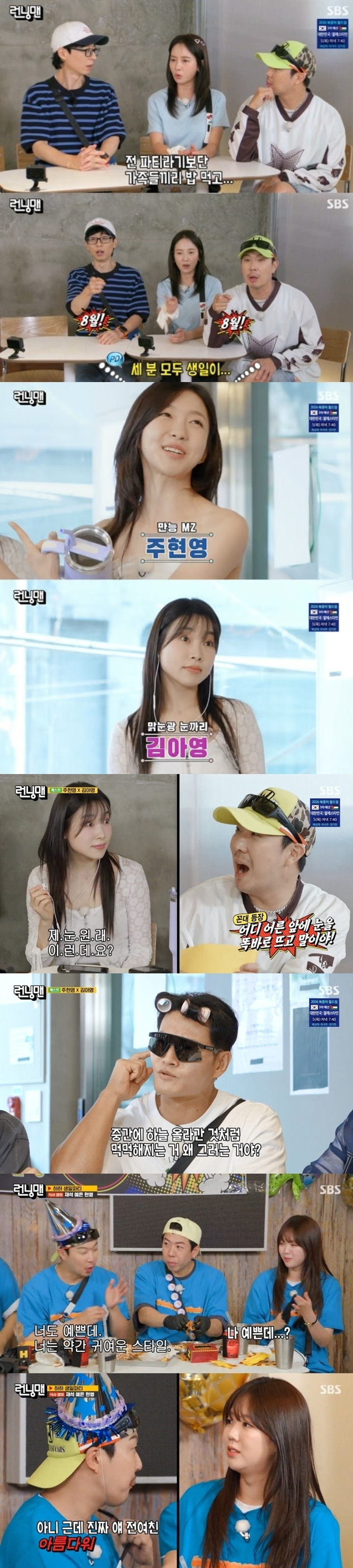 이날 방송은 ‘8월 생일자’ 유재석, 하하, 송지효의 생일을 축하하는 ‘해피 다이스 데이’ 레이스로 꾸며져 ‘MZ 후배’ 주현영, 김아영이 게스트로 출격했다. 멤버들이 ‘가짜 MZ’라면 주현영, 김아영은 ‘SNL 코리아’의 MZ 캐릭터 그대로 오프닝 상황극에 과몰입하는 모습을 보였다. 주현영은 ‘브이로그’ 콘셉트라며 개인 카메라를 들고오는가 하면, 김아영은 특튜의 ‘눈까리’ 캐릭터로 눈길을 끌었다. 이에 지예은은 절친한 게스트들이 등장하자 “제 잔바리들”이라고 말하며 은근한 신경전을 벌여 웃음을 선사했다.