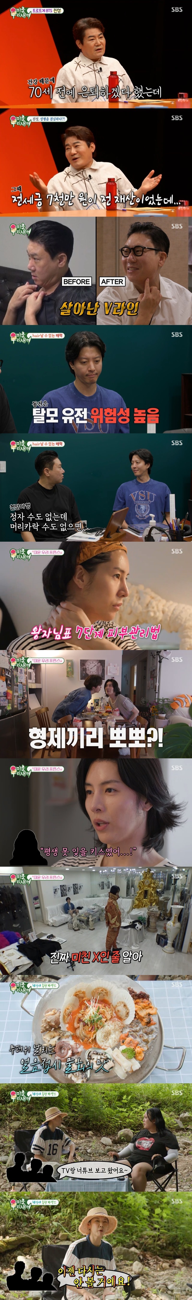 턱 밑 지방 흡입 수술을 받은 상민의 모습이 공개됐다. 확연히 달라진 V라인을 자랑하는 상민에게 이동건은 “형의 태도 자체가 자신감 있어졌다”라며 “사실 정수리가 비어 고민이다. 흑채를 뿌리고 촬영한지 10년도 넘었다. 어머니가 ‘미우새’를 모니터 하시는데 속상해하신다”라며 오래된 고민을 털어놓았다. 이동건과 이상민은 함께 탈모 전문 병원을 찾아 탈모 유전자 검사를 진행했고, 이동건은 ‘남성형 탈모 위험도 높음’이라는 결과에 충격을 숨기지 못했다. 반면 이상민은 ‘위험도 낮음” 결과에 안심했다. 이동건의 얇은 모발 상태에 안타까워하던 이상민은 “살아있는데 죽은 상태 같다. 예전 내 정자 검사할 때 같다”라고 웃픈 심경을 표현했다. 한편 흰머리는 있지만 머리카락 수는 풍성한 것으로 나온 이상민은 “정자 수도 없는데 머리카락 수도 없으면 큰일 날 뻔 했다”라며 가슴을 쓸어내렸다. 이어 두피 문신에 도전하는 이동건의 모습이 예고되며 궁금증을 높였다.